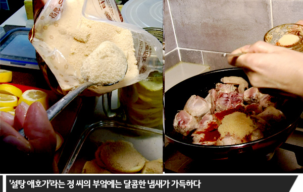 설탕 열 숟가락을 넣고 국과 반찬에도 설탕을 아낌없이 넣는다.